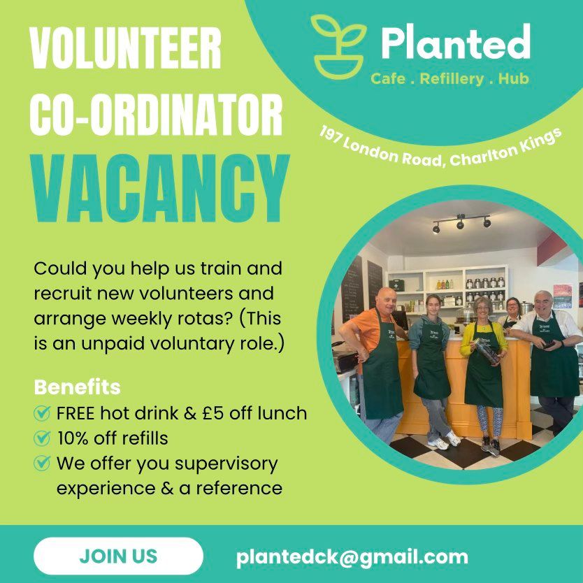 Arranging weekly rotas for our community cafe/refill shop & replying to messages (can be remote). Helping train volunteers (occasional, in-person Tues -Thurs).